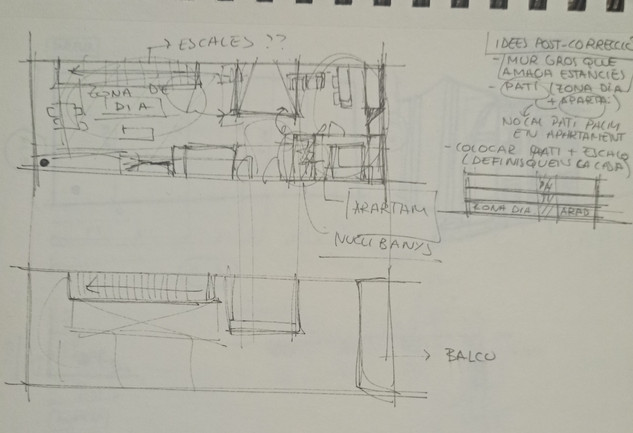Yo empece a trabajar con dibujos a mano alzada, unos primeros bocetos. Primeramente de la zona de trabajo, del entorno y de las casas propias del barrio del cabanyal. Una vez hechos estos bocetos y dibujos, y habiendo estudiado con detalle el programa requerido para el proyecto empezaron a surgir mis primeras ideas, para esta emblimatica casa.